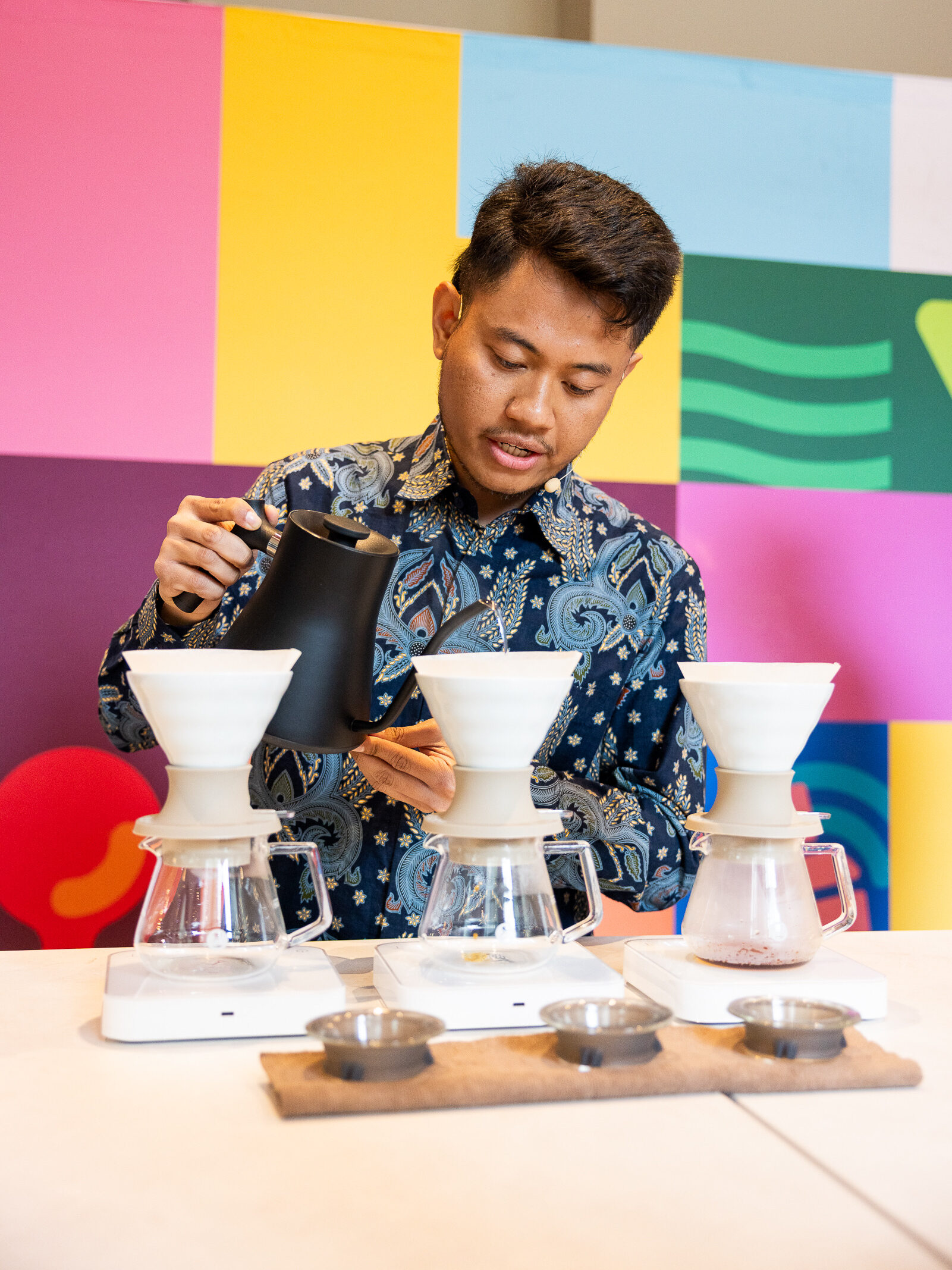 I ended up blending Gesha and Red Bourbon from the same farm, Finca Anaya in Huila, Colombia, both washed coffees sourced and roasted by Hermanos. With just three weeks to prepare, I leaned heavily on my team for support, especially in shaping the script and structure.